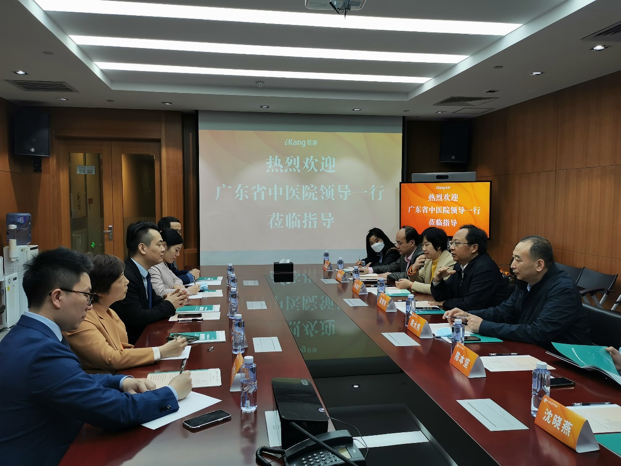 参观完毕后,双方进行了进一步交流座谈。张博经理从爱康国宾的企业理念和旗下业务等方面进行了详细介绍。2021年,爱康为约900万人次提供体检和健康管理服务,其中广州区体检接待量近60万人次。翟理祥书记表示,广州中医药大学历来重视校企合作,此次调研也是在贯彻落实党中央、国务院对高校毕业生就业工作的决策部署的背景下,学院党委按照专项行动落实方案,走访企业,带动高效率推动毕业生就业工作,学校也将尽最大所能发挥科技、人才资源优势回馈社会。随后陈大伟、朱旭红、陈本坚分别介绍了学院学生教学、医院对外合作交流等情况。双方就进一步开展科学研究、人才培养的合作等进行深入交流。张博总经理表示,作为中国收入规模领先的中高端连锁体检与健康管理集团,业务涵盖了健康体检、疾病监测、私人医生、职场医疗、疫苗接种等多方面,因此需要大量医药相关人才。