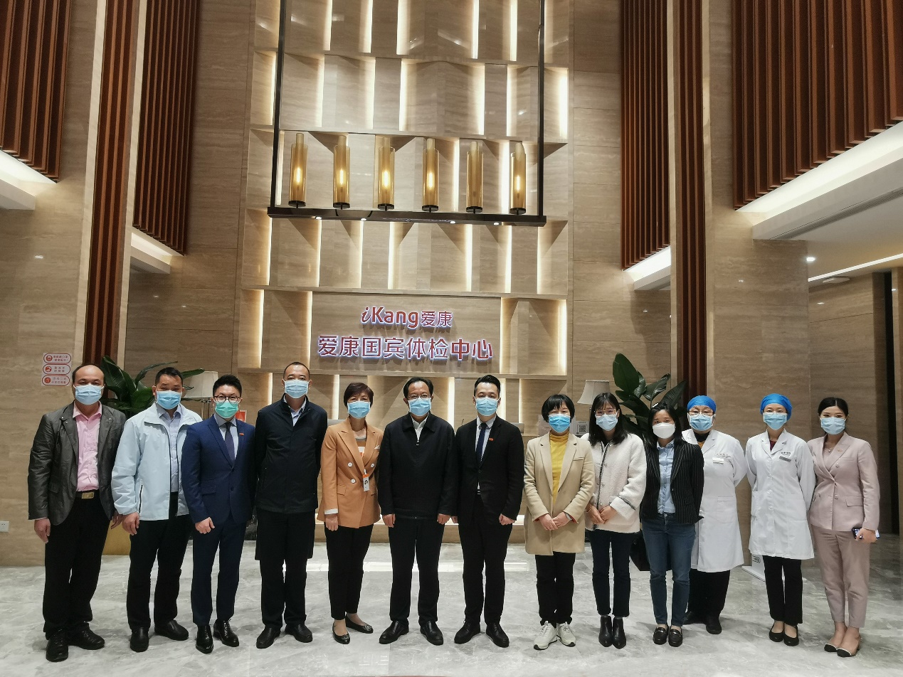 在爱康国宾广州环市东分院,集团广州区总经理张博先生和广州区管理团队带领大家参观并体验爱康国宾的智能化服务设施。张总经理介绍,集团是中国领先的中高端连锁体检与健康管理集,通过旗下多个品牌,为团体客户和家庭、个人提供高品质的健康体检、疾病检测、齿科服务、私人医生、职场医疗、疫苗接种、抗衰老等健康管理与医疗服务。截止2022年4月初,已在全国59大城市设有155家体检与医疗中心,60余家齿科中心,其中广州区7家体检中心,1家爱康君安、2家爱康卓悦、4家爱康国宾,4家齿科中心,1家振兴国医馆。