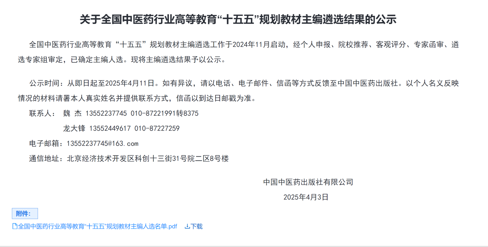 2025年4月,中国中医药出版社公示“十五五”规划教材主编(第一轮)入选名单,我院刘良、张忠德、丁邦晗三位老师分别担任《中西医结合思路与方法》、《中西医结合急救医学》、《急诊医学》三部教材第一主编,展现了我院在中医药高等教育领域的教学与科研实力。