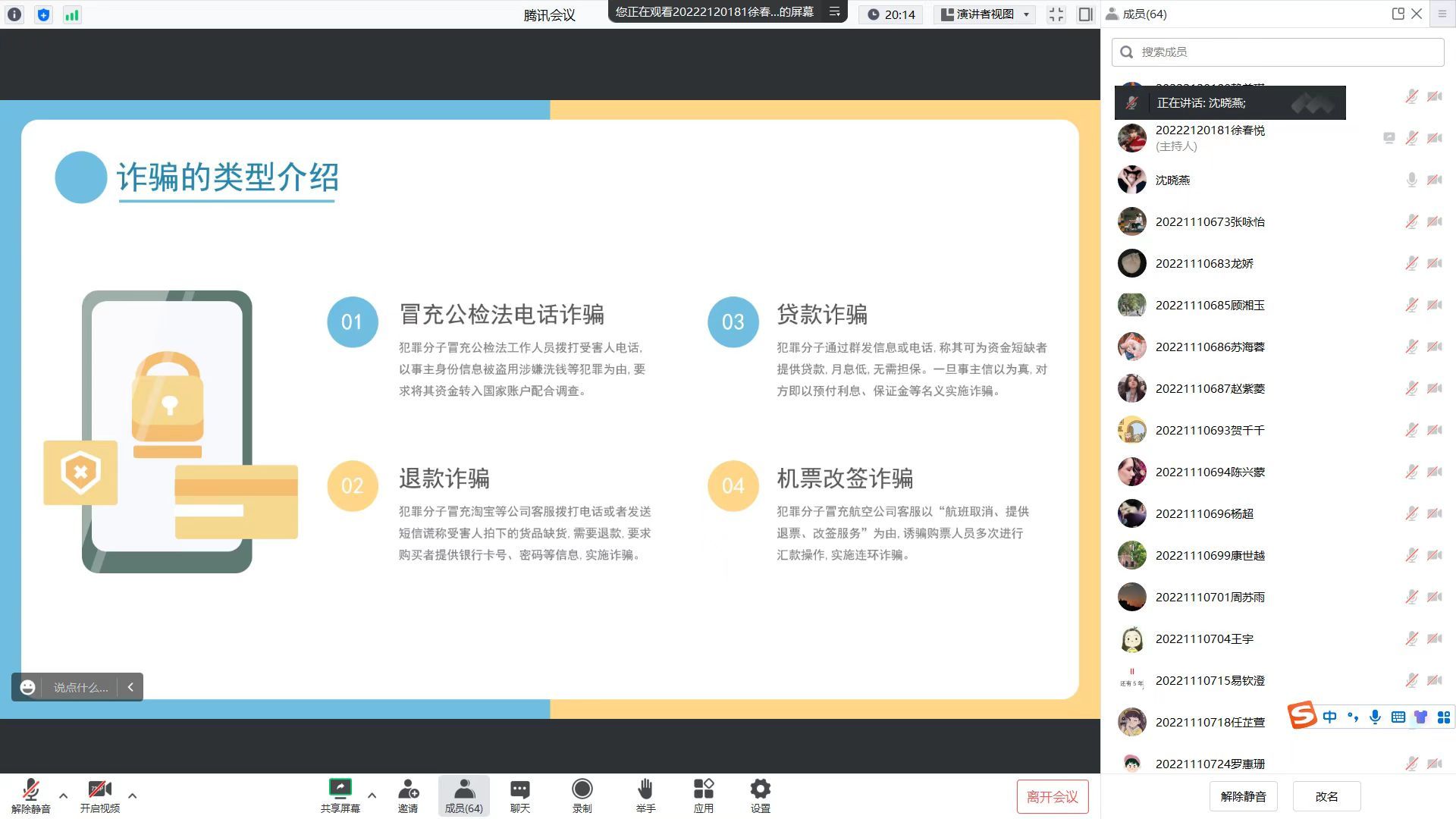 为进一步提高同学们安全意识和诈骗防范能力,切实维护广大学生人身财产安全。我院辅导员沈晓燕老师于2023年4月13日下午开展线上“防诈骗”主题班会。通过班会提高学生对网络诈骗的防范能力,坚决遏制诈骗事件在学生中发生。