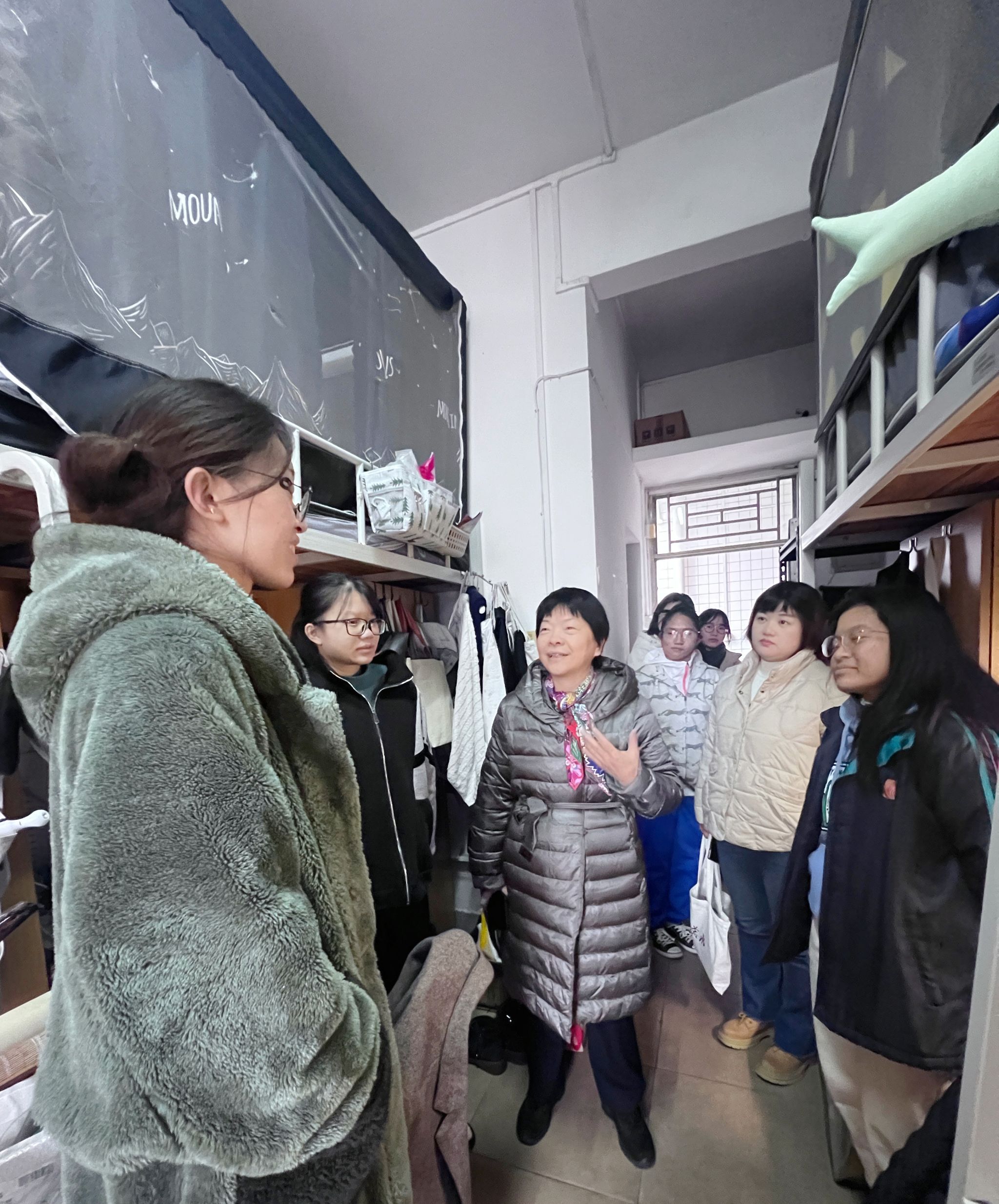 当天早上8点半,卢传坚副院长就来到三元里校区3B栋女生宿舍,在辅导员许丽梅老师、班主任陈贤坤老师的陪同下走访学生宿舍,她对学生的基础设施和生活情况非常关心,就住宿环境、饮食问题、安全问题、宿舍关系等与学生展开亲切交谈,鼓励同学们珍惜在校时光,营造相互关心、相互关怀的宿舍氛围,让宿舍变成一个温馨、安全的港湾。