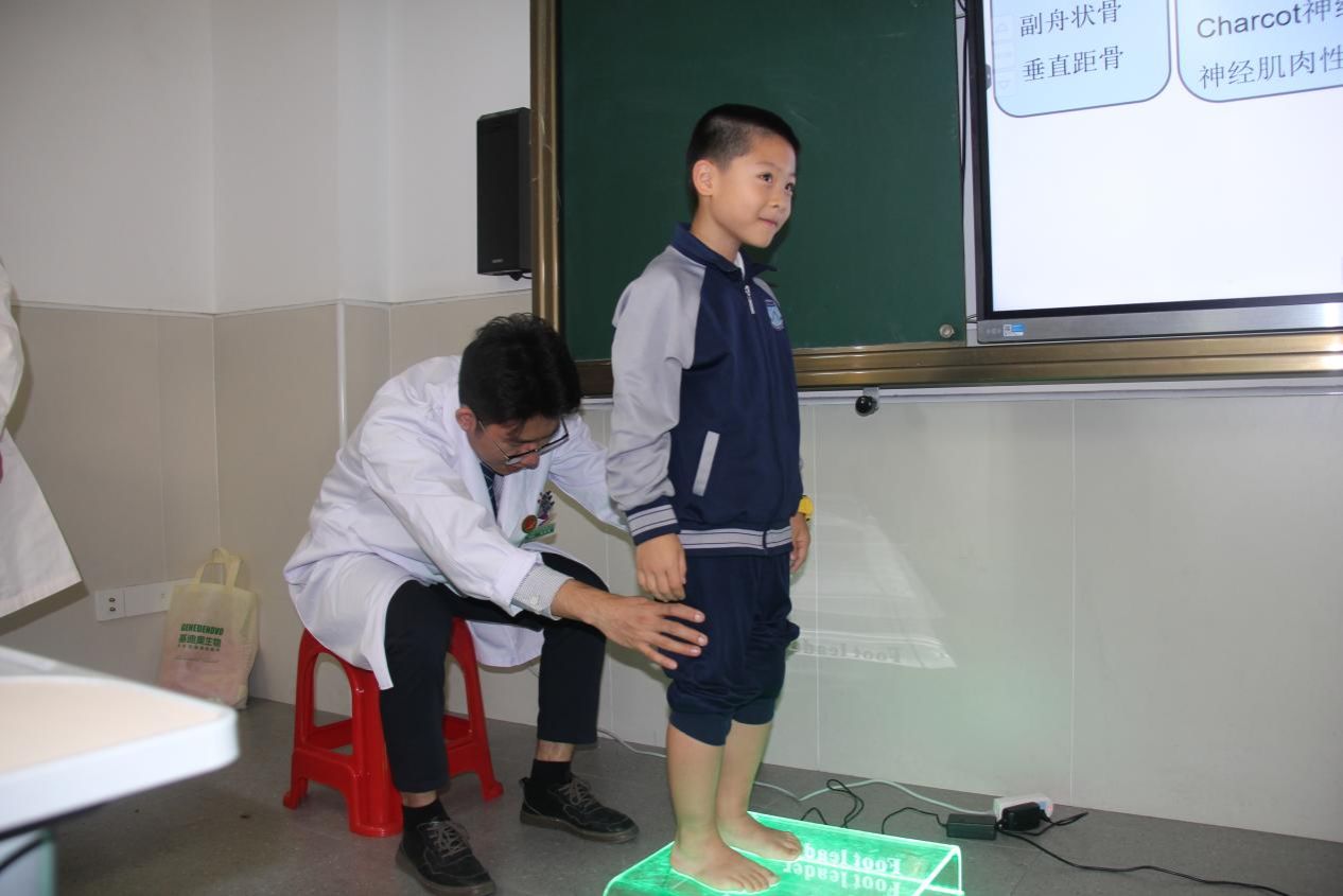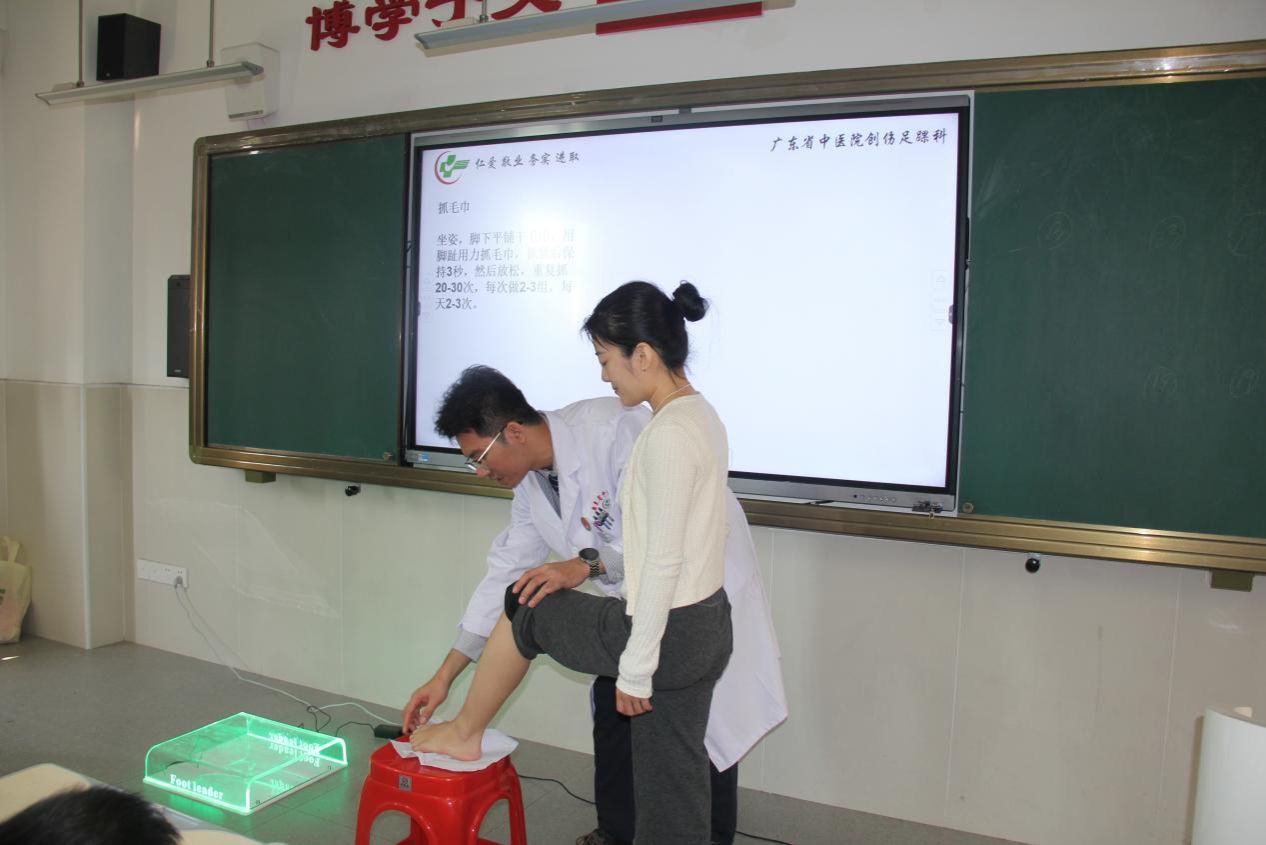 活动的第一项内容是由研究生第九党支部书记陈海明同志为同学们生动地讲解了作为国家级非物质文化遗产——凉茶的起源与发展历程,并顺应时令介绍清肺润燥等茶饮的组成和应用。第二项内容由创伤足踝科的梁家畅医生详细介绍了扁平足的形成原因、常见表现以及预防和治疗方法,并为在场师生进行了扁平足的筛查;在这次筛查中,许多学生揭示了潜在的扁平足问题,并获得了医生的专业指导。检查结束后,同学们还参与了足部保健操的学习。