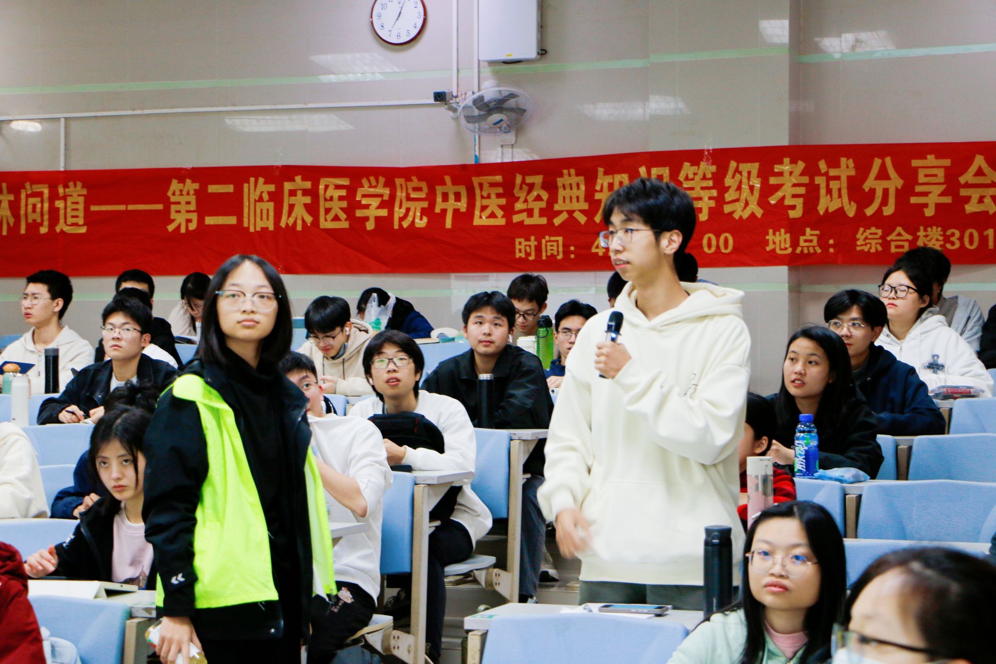 随后,四位分享人立足不同维度呈现学习和备考智慧。2022级莫凯麟阐释了“分类记忆法”,通过六经辨证框架将《伤寒论》庞杂内容系统梳理。2021级江桐羽揭秘“碎片化研习术”,以思维导图串联经典条文,实现理解性记忆的质效双升。2021级余悦通过真实医案解析《金匮要略》的方剂应用,强调“临床思维赋能应试突破”的独到理念。2021级黄丰恩则聚焦三级考试新变革,独创民族医学“关键词记忆矩阵”,为高效备考提供全新范式。