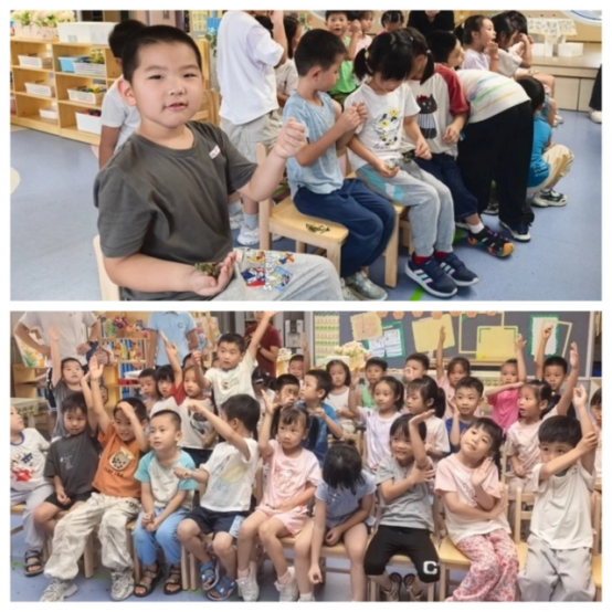 小朋友们进行药材辨识和积极举手回答问题