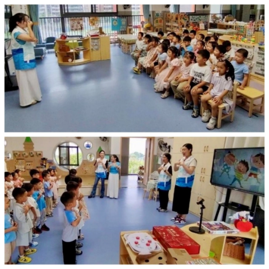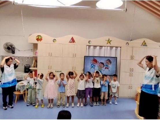 小朋友分组展示保健操教学成果